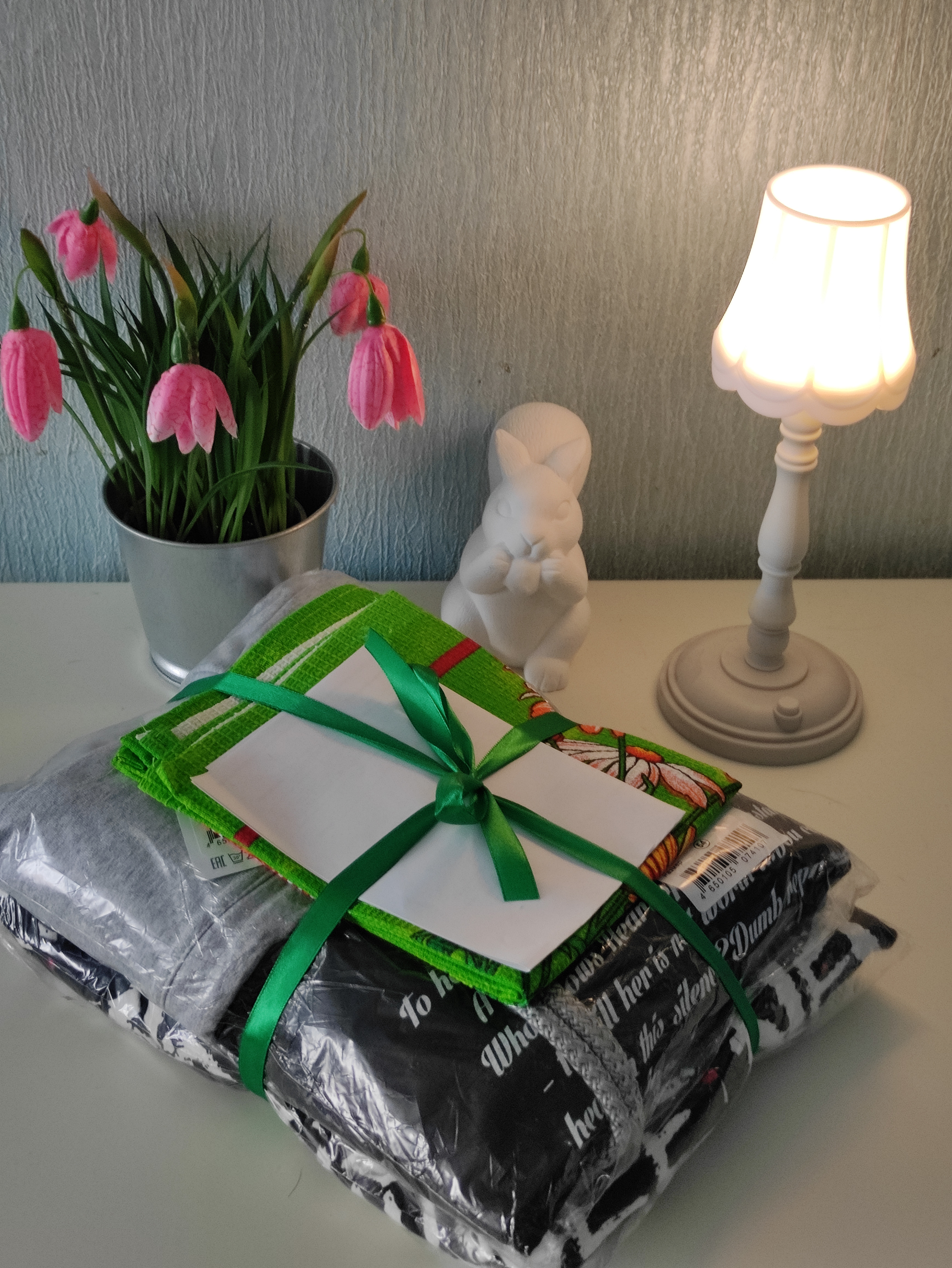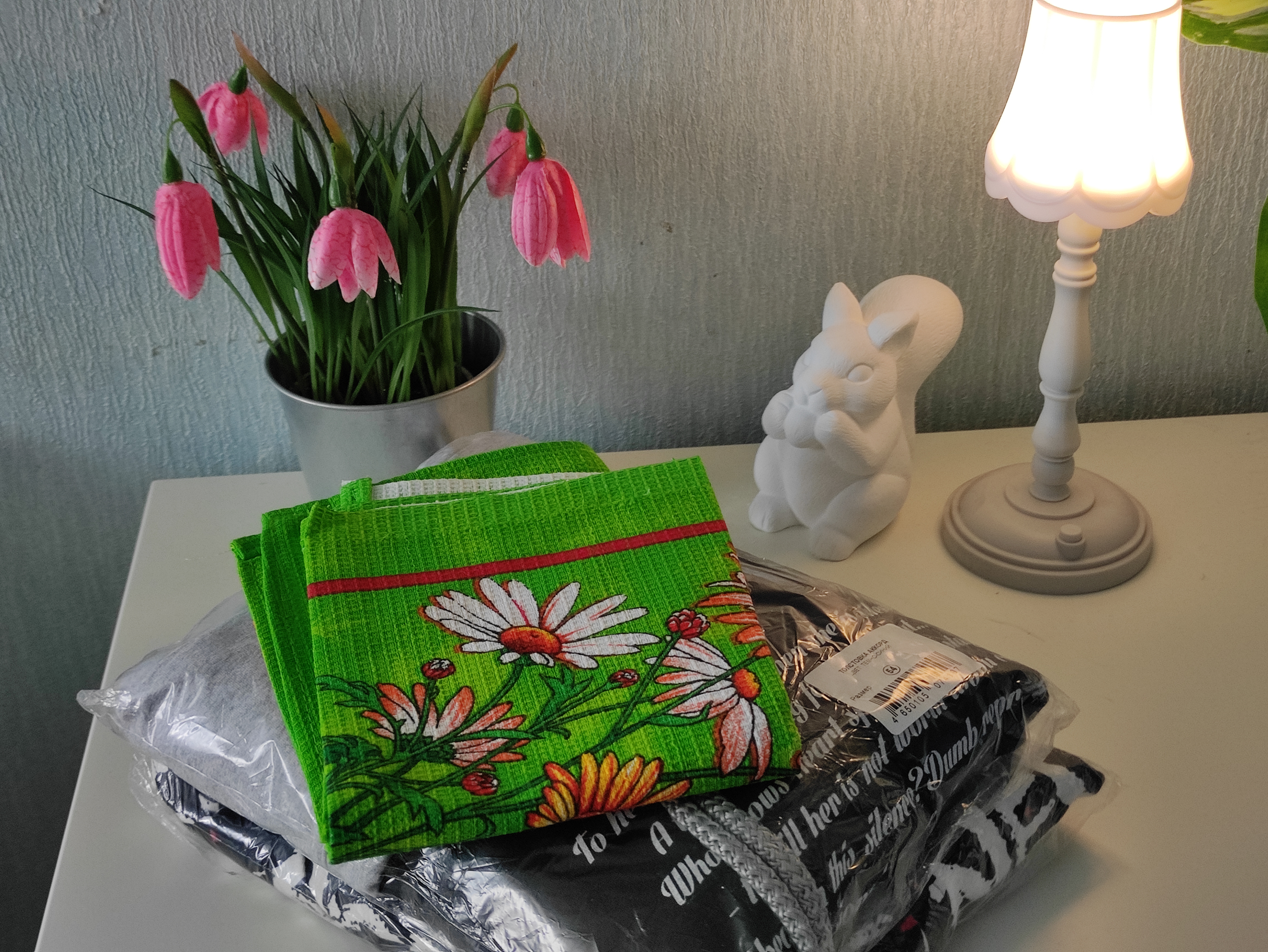 Товар понравился, скатерть и простынь хорошего качества кофточка качество среднее, доставка быстрая, пункт получения удобный.