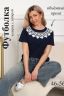 Футболка женская прямого силуэта. Низ изделия прямой. Длинна до середины бедра, плечо на естественном месте, рукав короткий. Горловина круглой формы, обработана планкой . Принт (шелкография пуф) в виде кружевного воротника.