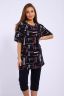 Костюм женский выполнен из трикотажного полотна кулирка. Костюм состоит из футболки и бридж. Футболка свободного силуэта с карманами в боковых швах, рукав короткий, горловина, низ рукава, вход в карман окантованы двойным кантом Бриджи прямые, цельнокраенный пояс на резинке.
