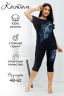 Костюм женский из кулирного полотна состоит из футболки и бриджей. Футболка прямой силуэт, горловина круглая, рукав короткий втачной, низ изделия обработан на плоскошовной машине, на полочке принт. Бриджи - прямые, верх на резинке, низ обработан на плоскошовной машине.