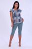 Домашний женский костюм изготовлен из кулирки - 100% хлопка. Женский костюм состоит из майки и брюк. Майка полуприлегающего силуэта с округлой горловиной. Бриджи прилегающие с карманами, притачным поясом, низ обработан на плоскошовной машине.