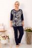 Костюм женский из кулирного полотна состоит из кофты и брюк. Кофта прямой силуэт, горловина круглая, рукав спущенный ¾, на манжете, низ изделия фигурный, перед короче спинки, горловина и низ изделия обработаны окантовкой. Брюки прямые, в боковых швах лампасы из отделочного полотна и внутренние карманы, низ изделия обработан на плоскошовной машине.