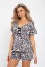 Костюм состоит из футболки и шорт. Футболка с короткими рукавами. По отрезному лифу заложены складки на объем груди. Зона декольте украшена атласным бантиком.