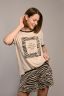 Комплект с шортами из вискозного полотна. Футболка прямого силуэта, очень объемная с коротким рукавом и печатным рисунком имитирующим расцветку шорт. Шорты средней длины с коническим расширением к низу на притачном поясе с резинкой. Комплект выполнен в стиле "ОВЕРСАЙЗ", рекомендуется брать на 1 размер меньше.
