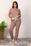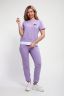 Костюм женский трикотажный - футболка и брюки. Футболка укороченная с отделкой по низу контрастного цвета. Брюки с завязками и втачными боковыми карманами. На футболке и брюки небольшие отделочные печати.