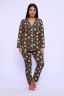 Пижама свободного кроя из мягкой хлопчатобумажной ткани. Комплект состоит из кофты и брюк. Кофта с длинным рукавом, на пуговках и с карманом на груди. Атласный кант по подборту, воротнику, карману и манжету. Брюки прямые с карманами. Эта пижама отлично подойдет как домашний костюм, так и для сна. А расцветка сочные яблоки поднимет настроение.