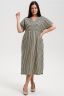 Платье прямого силуэта, с V-образной горловиной спереди, с декоративными элементами на накладных карманах, с разрезами в нижней части боковых швов. Рукав цельнокроеный, короткий, с манжетом. Горловина полочки обработана обтачкой. Горловина спинки и верх карманов обработаны бейкой из основного полотна.