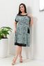 Платье женское полуприлегающего силуэта, расклешенное к низу. Рукав короткий цельнокроеный. Полочка асимметрично разделена по вертикали на две части. Кокетка правой полочки, нижняя часть полочки и рукава, карман из х/б сетки. Вход в карман, горловина и низ рукава окантован бейкой из основной ткани.