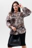 Туника женская больших размеров из плотной ткани. Изделие с округлой горловиной на завязках, рукава длинные на резинке, низ округленный и расклешенный с разрезами. Подойдет для повседневной носки.