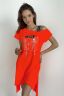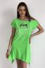 Туника полуприлегающего силуэта, длиной выше колена спереди и удлиненной спинкой сзади, с фигурной линией низа. Рукав цельнокроеный, короткий. В нижней части боковых швов обработаны разрезы. Горловина асимметричная с эластичной бретелью, обработана обтачкой из основного полотна.