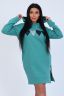 Туника женская из мягкого футера с лайкрой 2-х нитка, качества карде. Модель с капюшоном, спущенная пройма, длинный рукав и низ туники обработаны широким манжетом. На передней полочке стильный принт в виде сердец и в виде шеврона внизу, в боковом шве функциональная декоративная молния. Модное, уютное платье отличный вариант офисного гардероба для современной деловой девушки.