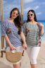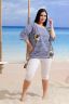 Туника женская, прямого силуэта. Горловина округлая, Рукав цельнокроенный со швом. Полочка состоит из трех частей, Спинка из двух, где удачно сочетаются ткани - компаньоны: средняя полоса и пальмы. На полочке нагрудный накладной карман. Низ туники с одной стороны собран на эластичную тесьму, с другой стороны: в люверсы продета бейка-утяжка.