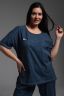 Туника прямого силуэта, с округлой горловиной, с удлиненной спинкой, длиной до середины бедра. На полочке расположены фигурные накладные карманы. Полочка и спинка с кокетками. Рукав короткий. В нижней части боковых швов обработаны разрезы. Горловина обработана бейкой из основного полотна.